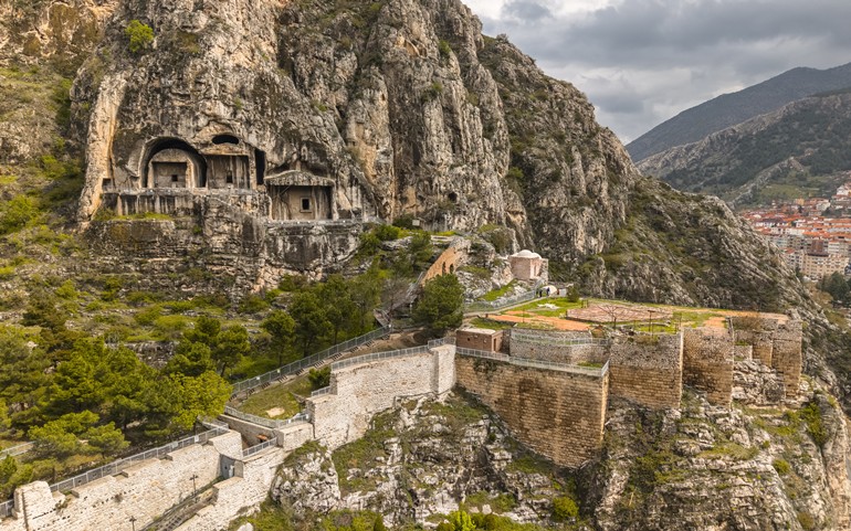 아마샤 북쪽의 하르세나 산 비탈에는 기원전 3세기 무렵부터 약 기원전 2세기까지 조성된 왕실 바위 무덤들이 자리하고 있습니다. 이 무덤들은 기원전 281년경 미트리다테스 1세가 폰투스 왕국을 세우고 수도를 아마세이아(현재의 아마샤)로 정한 뒤, 그의 후계 왕들을 위해 건립한 왕족 납골장입니다. 총 21개의 크고 작은 바위 무덤이 있으며, 그 중 주요 무덤 5개는 기원전 3~2세기에 재위했던 왕들이었던 미트리다테스 1세, 아리오바르자네스, 미트리다테스 2세, 미트리다테스 3세, 파르나케스 1세를 위해 만들어졌습니다. 무덤들은 석회암 절벽을 직접 깎아 만든 구조로, 높이는 약 8미터에서 가장 큰 것은 15미터에 이릅니다. 일부 무덤은 기둥을 세운 파사드 형태를 갖추고 있으며, 내부에는 돌로 된 묘실이 있습니다. 이 무덤군은 북아나톨리아에서 헬레니즘 시대 왕국이 남긴 가장 중요한 고고학 유적 중 하나로 평가되며, UNESCO 세계문화유산 잠정 목록에도 등재되어 있습니다.