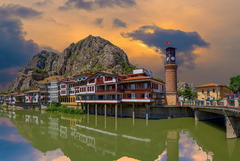아마시아의 중심에는 아마시아 시계탑 이 자리잡고 있습니다. 이 시계탑은 1865년 당시 아마시아 총독이었던 시인 겸 정치인 지야 파샤(Ziya Pasha)에 의해 세워졌습니다. 초창기에 화재로 소실되었다가, 2002년에 원형을 따라 재건되었다는 기록이 있습니다. 구시가지에는 19세기 오스만 제국 양식으로 지어진 목조 가옥들이 남아 있으며, 이는 이 지역에서 보기 드문 전통 주택 형태를 보여주는 중요한 건축유산입니다. 또한 이 옛 집들과 함께, 강가를 따라 늘어선 거리와 좁은 골목, 골목을 따라 흐르는 강(예실르르막 강)의 풍경이 어우러져, 과거 도시의 정취를 느낄 수 있는 공간을 형성합니다. 이처럼 아마시아의 시계탑과 구시가지는 단순한 건축물이 아니라, 오스만 시대와 그 이전 역사가 겹겹이 쌓인 ‘살아 있는 역사 마을’로서의 가치를 지니고 있습니다. 관광객에게는 조용하고 정감 있는 분위기 속에서 터키 북부의 전통과 역사를 체감할 수 있는 매력적인 장소입니다.