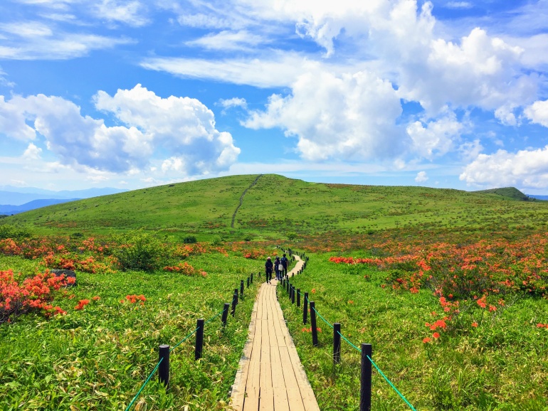 일본 명산 100선 중에서도 「즐길 만한 산」의 대표격으로 칭송 받는 구루마야마는 따뜻한 햇빛, 두근거리는 봄에 새빨간 주황 철쭉 (6월)이 선명하게 피어납니다. 꽃들이 앞다퉈 피는 여름을 지나면 산의 표면과 습원에 새겨진 빨강,주황,노랑,타오르듯 붉은 단풍을 바라볼수 있는 가을을 맞이합니다. 깨끗한 공기가 대지를 감싸 안아 상쾌한 고원 트레킹을, 빛나는 눈 경치가 펼쳐지는 겨울에는 스키나 스노보드, 스노슈 트레킹 등의 윈터 액티비티를 즐길 수 있습니다.