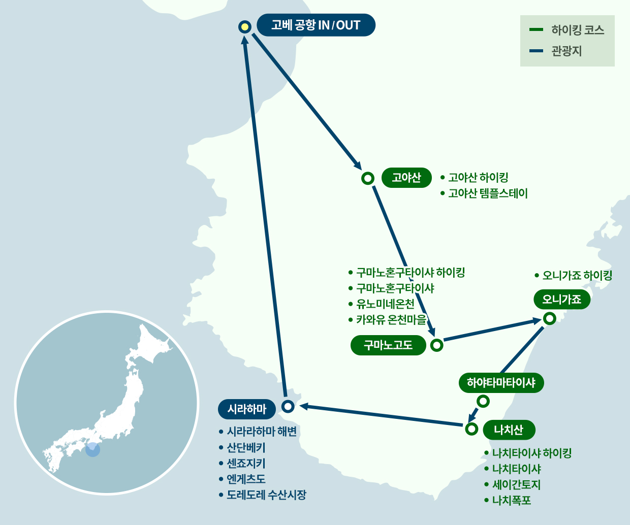 가와유 온천 출발 → 오니가죠 하이킹 → 하야타마타이샤 → 나치가쓰우라 → 시라하마로 이동 → 호텔 휴식