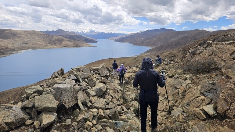▲ 설산과 어우러지는 얌드록쵸를 따라 내려오며 트레킹을 합니다.