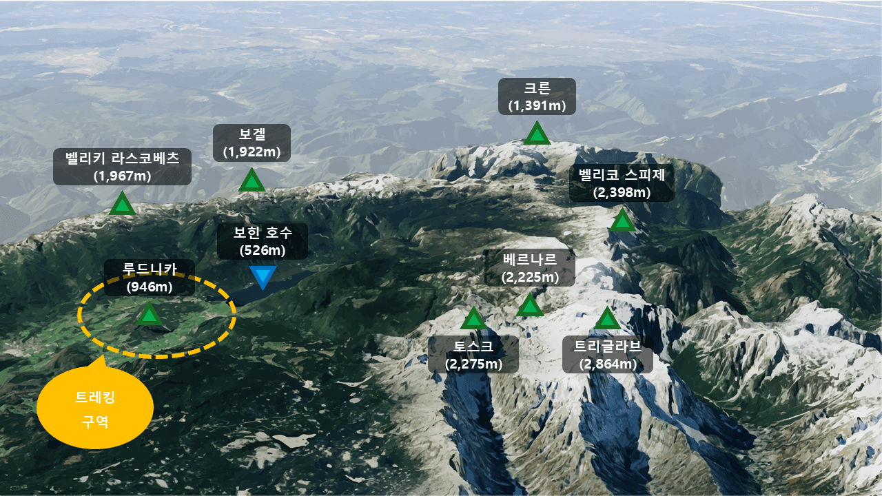 ▲ 해발 911m의 루드니차에 오르면 유리알과 같이 맑은 빙하호, 보힌즈 호수를 조망할 수 있습니다. 더불어 벨리키 라스코베츠(1,967m), 보겔(1,922m), 크른(1,391m), 트리글라브(2,864m) 등 슬로베니아에 위치한 알프스의 풍경을 즐길 수 있습니다.