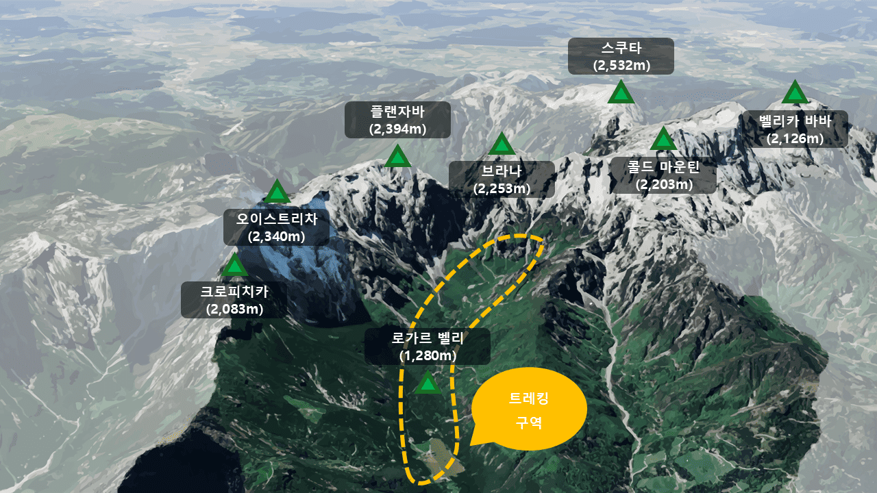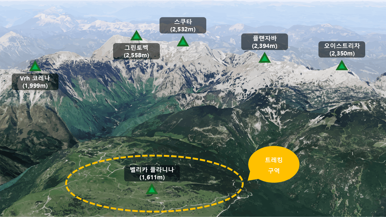 ▲ 벨리카 플라니나 고원 트레킹을 통해 그린토벡(2,558m), 스쿠타(2,532m), 플랜자바(2,394m) 등 다소 생소한 캄닉 알프스에 위치한 봉우리들을 조망할 수 있습니다.