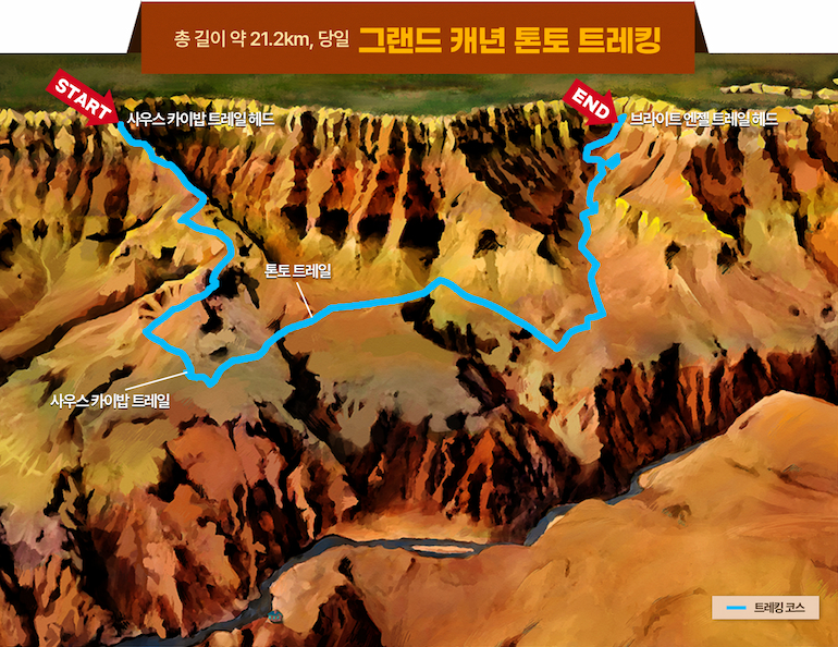 - 루 트 : 사우스 카이밥 트레일 헤드 → 톤토 트레일 → 브라이트 엔젤 트레일 헤드